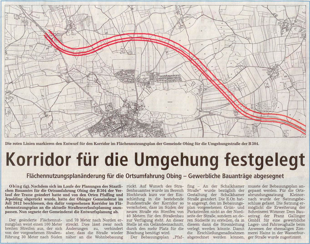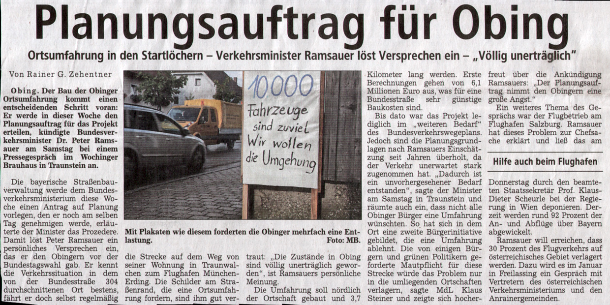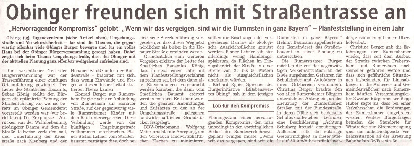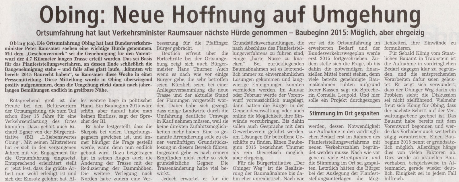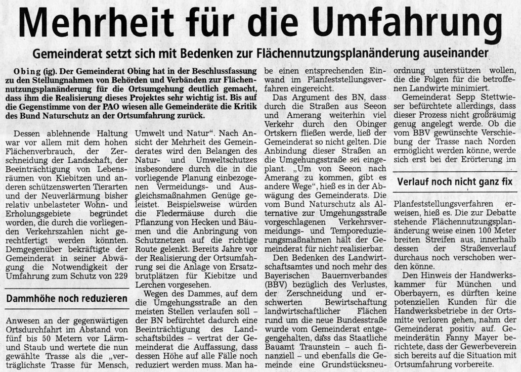 Auch wird nochmals geschrieben daß das Planfeststellungsverfahren für die Ortsumgehung Obing läuft.