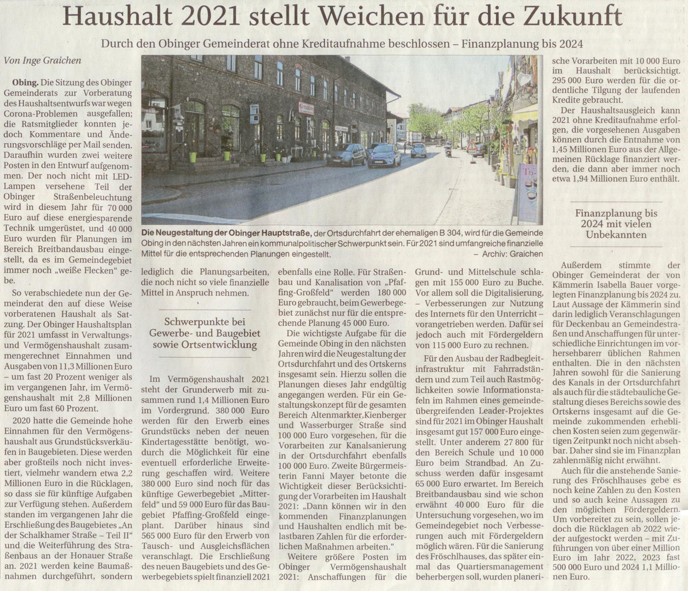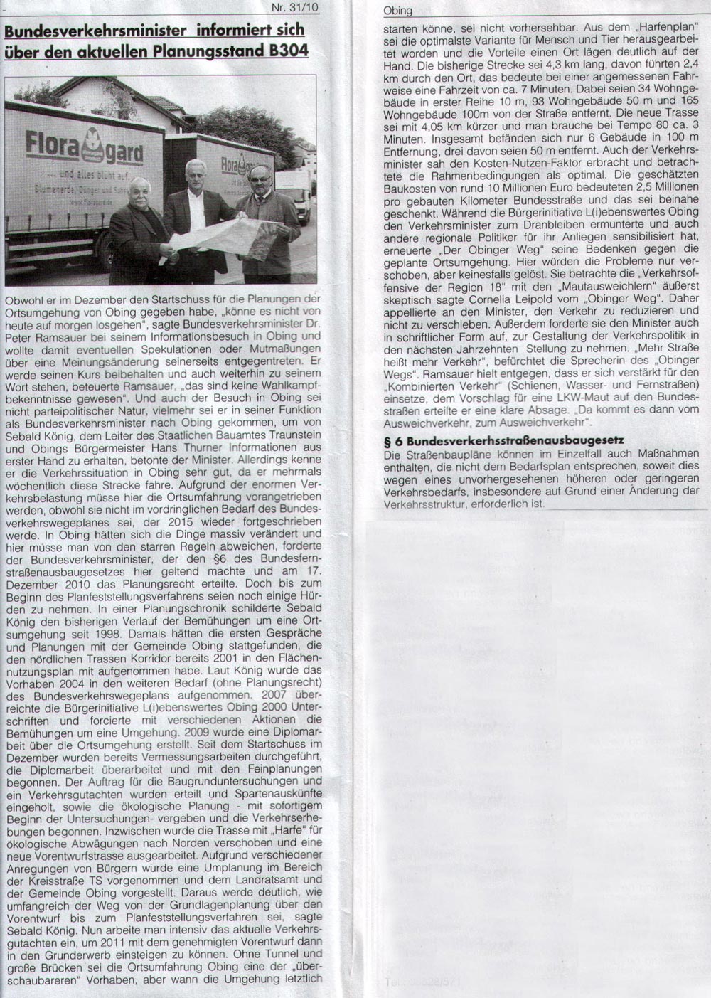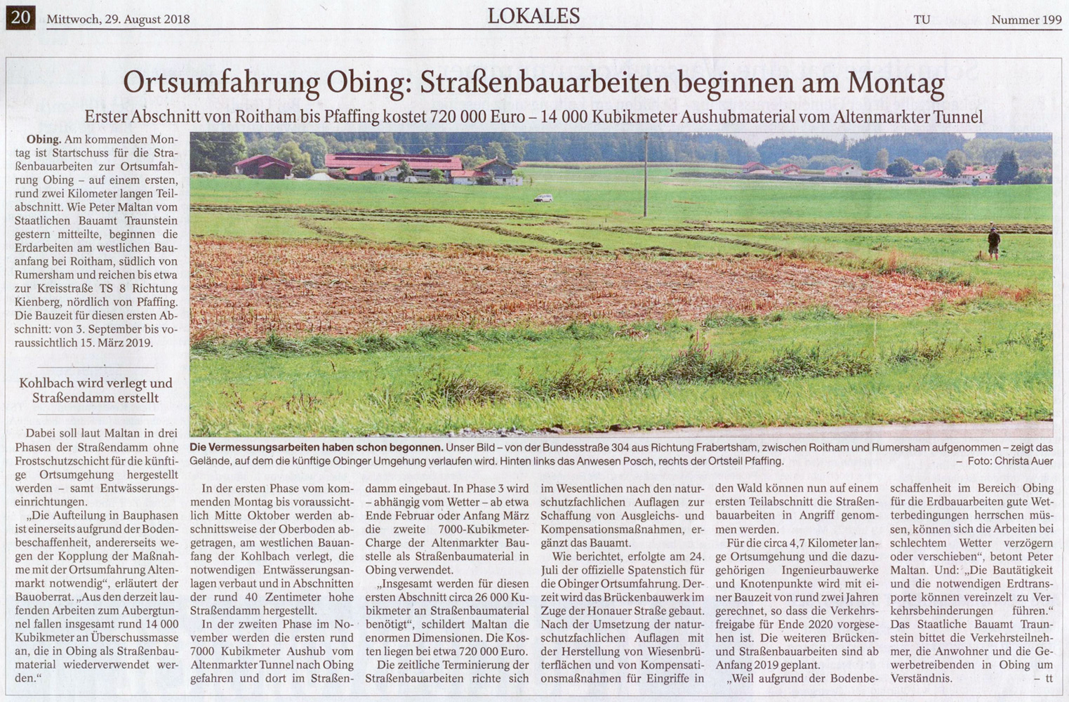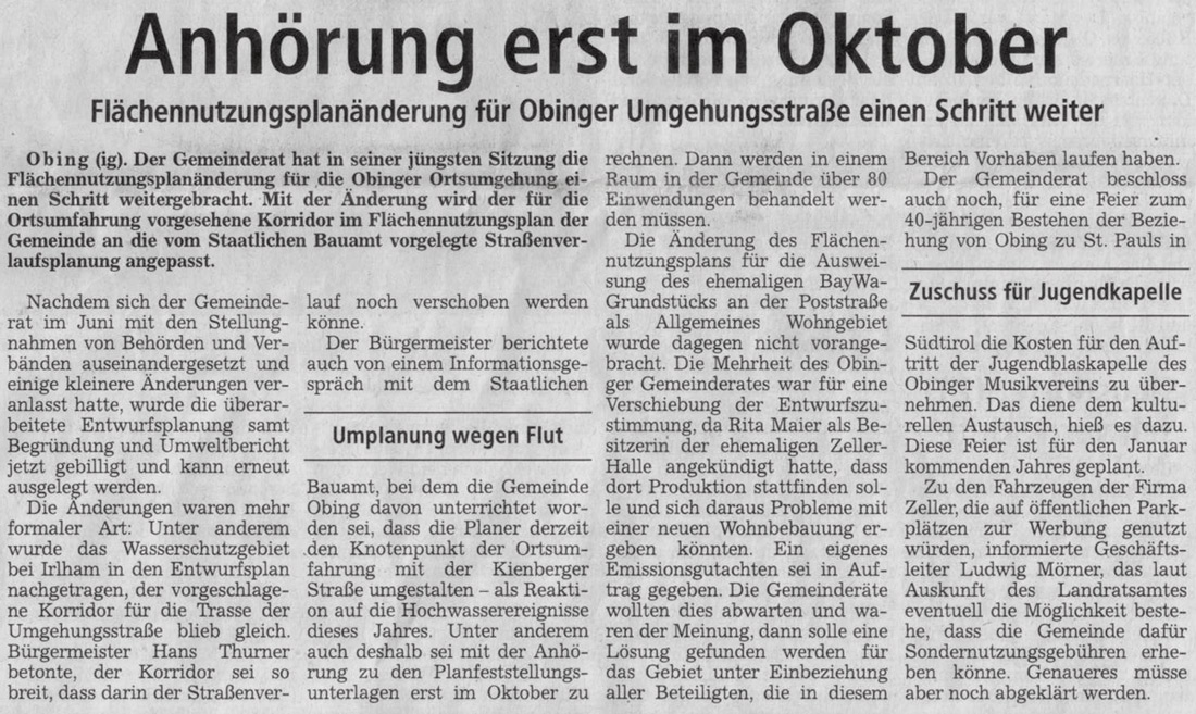 Auch wird nochmals geschrieben daß das Planfeststellungsverfahren für die Ortsumgehung Obing läuft.