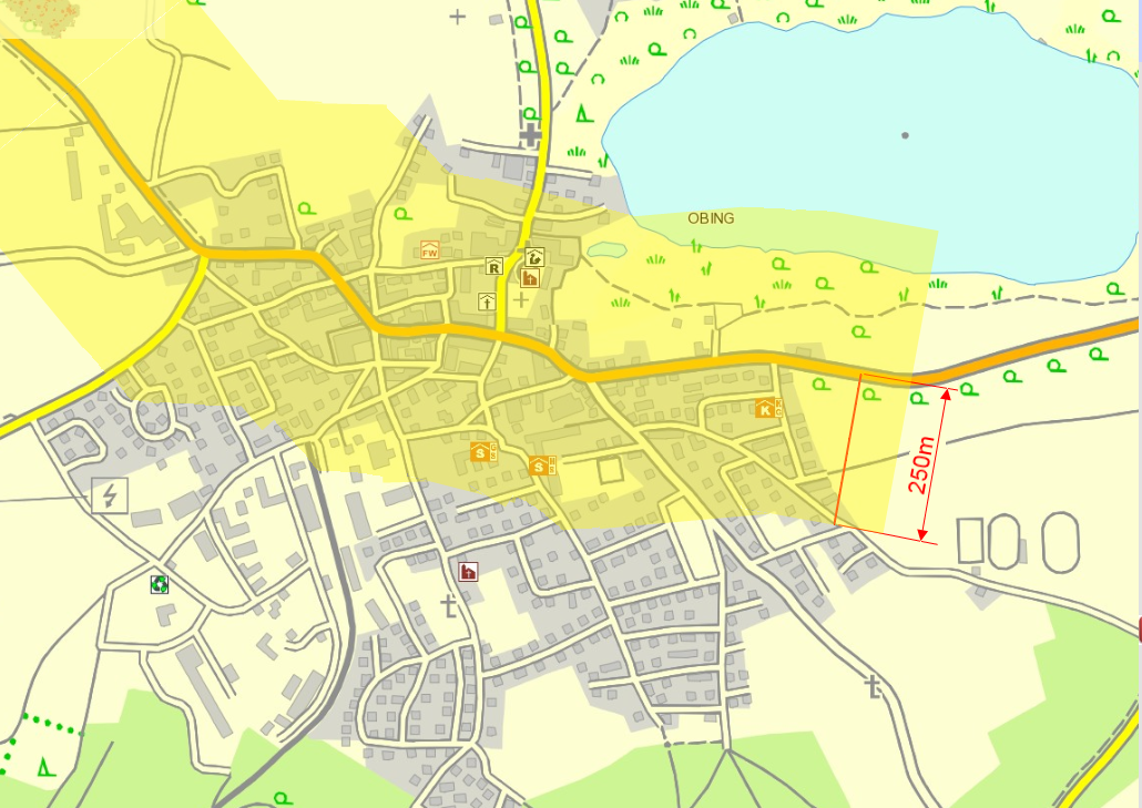 Mit einem Klick auf auf das linke Bild wird eine Grafik angezeigt auf der man einen 250-Abstandskorridor in Obing um die "B304 alt" sieht.