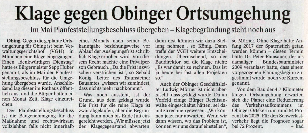 16.07.2016, Klage gegen Obinger Ortsumgehung